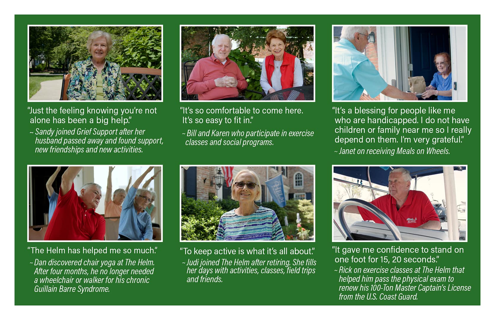 The purpose of The Helm is to inspire and enable residents of the Grosse Pointes and Harper Woods to enjoy the gift of longevity, living healthy and meaningful lives as they age. We provide programs and activities designed to help older adults stay healthy, connected and engaged. We also provide essential services including Meals on Wheels, Medical Loan Closet, Medicare Counseling, Information & Assistance and Caregiver Support.