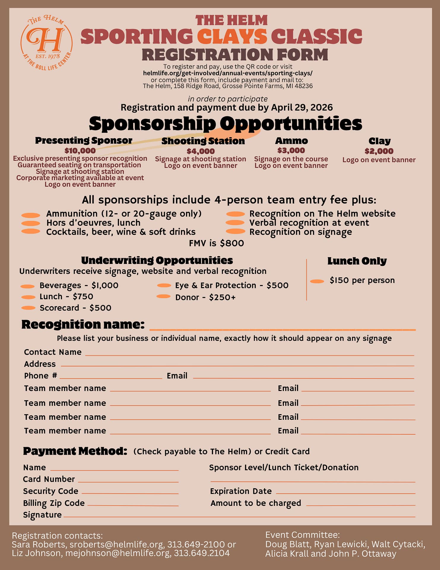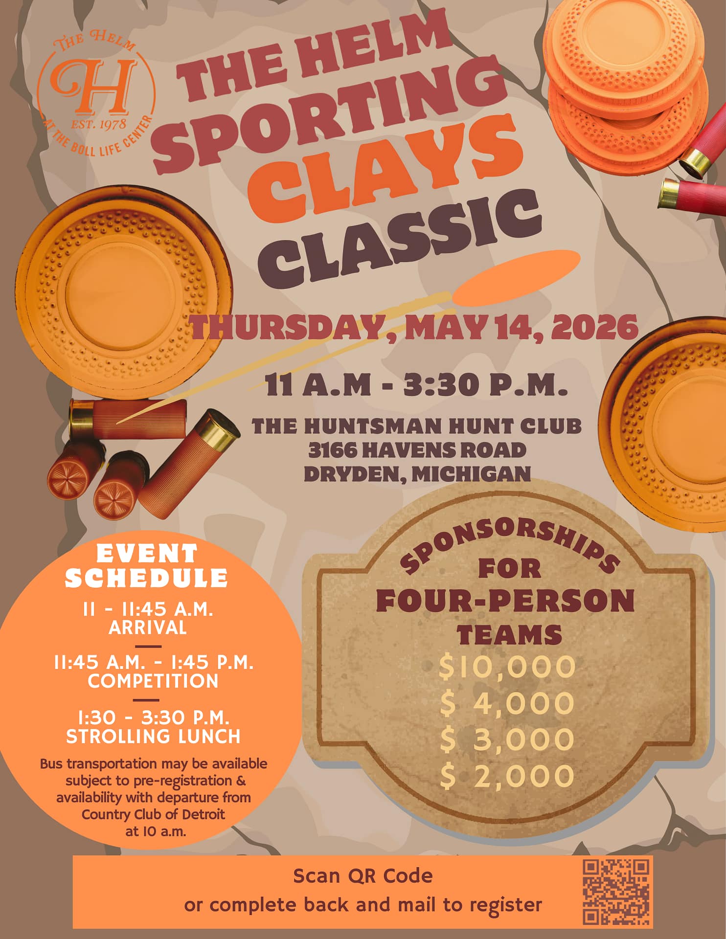 Registration is now open for the 2026 The Helm Sporting Clays Classic, Thursday, May 14, at The Huntsman Hunt Club, 3166 Havens Road, Dryden, Michigan.